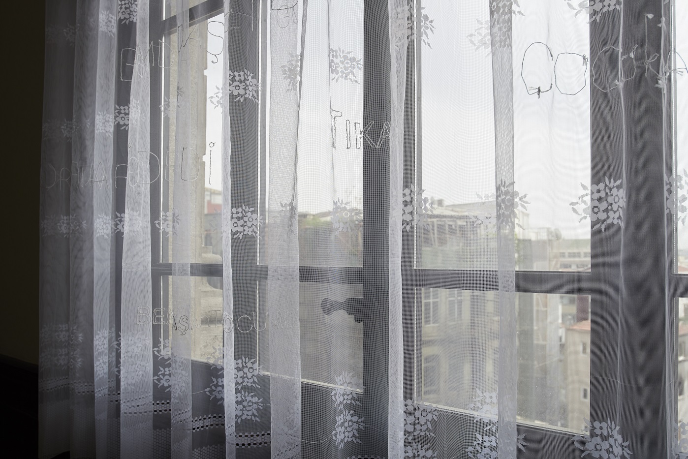 Neden perde ? “Ben hep penceresinin önünde, perdenin arkasında geçip giden insanların beni farketmelerini bekledim ” diye ekliyor. Bu cümle hikayenin bir esere dönüşmesinde kırılma noktası. Onun cümlelerini, onun perdesinin üzerine, onun yazı karakteriyle işliyorum. Kadının naifliği, kendini saklaması, dışarıyla olan sınırı, insanların ona müdahalelerine tutumu tıpkı bir perde gibi. İp ve perdenin birlikte kullanılması, iğnenin tülü yıpratması sesini duyduğumuz kadının imgesi.